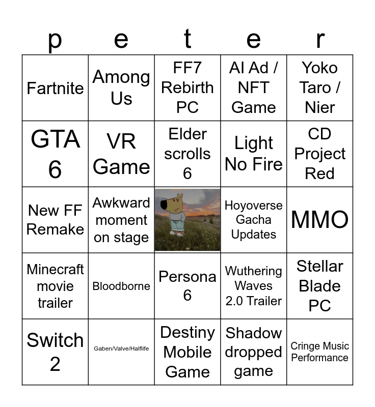 This bingo card has a free space and 24 words: Bloodborne, Gaben/Valve/Halflife, Elder scrolls 6, Switch 2, Yoko Taro / Nier, Fartnite, GTA 6, Among Us, Hoyoverse Gacha Updates, Persona 6, Light No Fire, New FF Remake, Wuthering Waves 2.0 Trailer, Stellar Blade PC, VR Game, Shadow dropped game, MMO, FF7 Rebirth PC, CD Project Red, Awkward moment on stage, Cringe Music Performance, Minecraft movie trailer, AI Ad / NFT Game and Destiny Mobile Game.