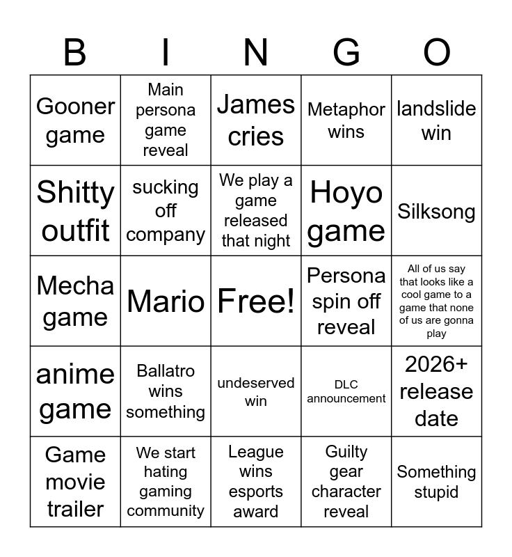 This bingo card has a free space and 24 words: Ballatro wins something, We start hating gaming community, We play a game released that night, Game movie trailer, landslide win, Gooner game, Shitty outfit, Main persona game reveal, Persona spin off reveal, undeserved win, Hoyo game, Mecha game, DLC announcement, 2026+ release date, sucking off company, Guilty gear character reveal, All of us say that looks like a cool game to a game that none of us are gonna play, James cries, Silksong, Mario, Something stupid, anime game, Metaphor wins and League wins esports award.