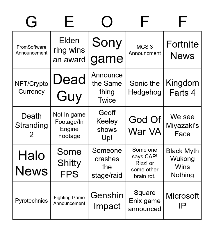 This bingo card has a free space and 24 words: Pyrotechnics, Some Shitty FPS, Announce the Same thing Twice, Square Enix game announced, Fortnite News, FromSoftware Announcement, Elden ring wins an award, Sony game, God Of War VA, We see Miyazaki's Face, Death Stranding 2, Dead Guy, Some one says CAP! Rizz! or some other brain rot., Black Myth Wukong Wins Nothing, NFT/Crypto Currency, Fighting Game Announcement, Genshin Impact, MGS 3 Announcment, Kingdom Farts 4, Halo News, Not In game Footage/In Engine Footage, Someone crashes the stage/raid, Sonic the Hedgehog and Microsoft IP.