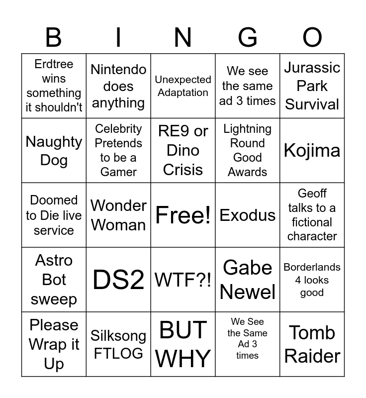 This bingo card has a free space and 24 words: DS2, Silksong FTLOG, RE9 or Dino Crisis, Please Wrap it Up, Jurassic Park Survival, Erdtree wins something it shouldn't, Naughty Dog, Nintendo does anything, Exodus, WTF?!, Lightning Round Good Awards, Doomed to Die live service, Gabe Newel, Borderlands 4 looks good, Celebrity Pretends to be a Gamer, We See the Same Ad 3 times, Geoff talks to a fictional character, Unexpected Adaptation, Kojima, Wonder Woman, Tomb Raider, Astro Bot sweep, We see the same ad 3 times and BUT WHY.