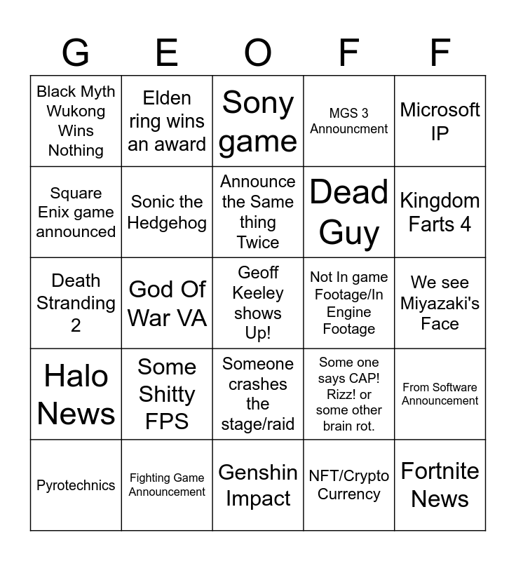 This bingo card has a free space and 24 words: Pyrotechnics, Some Shitty FPS, Announce the Same thing Twice, NFT/Crypto Currency, Microsoft IP, Black Myth Wukong Wins Nothing, Elden ring wins an award, Sony game, Not In game Footage/In Engine Footage, We see Miyazaki's Face, Death Stranding 2, Sonic the Hedgehog, Some one says CAP! Rizz! or some other brain rot., From Software Announcement, Square Enix game announced, Fighting Game Announcement, Genshin Impact, MGS 3 Announcment, Kingdom Farts 4, Halo News, God Of War VA, Someone crashes the stage/raid, Dead Guy and Fortnite News.