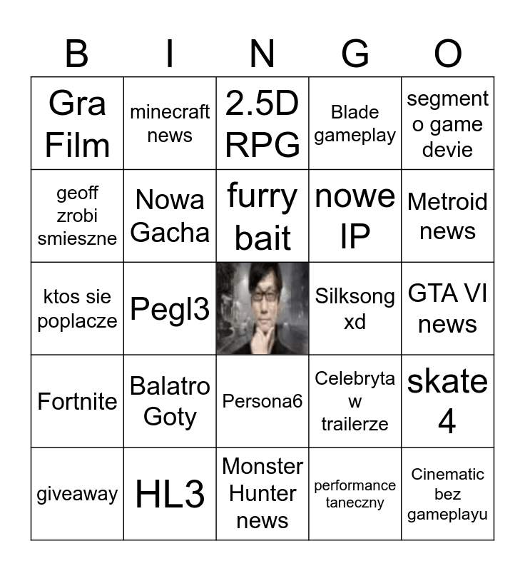 This bingo card has a free space and 30 words: HL3, Patolodżik 3, Pegl3, Lies of P dlc, Gra Film, 2.5D RPG, Nowa Gacha, Persona6, Silksong xd, Monster Hunter news, GTA VI news, Cinematic bez gameplayu, performance taneczny, random event z widownią, Metroid news, Final Fantasy news, Celebryta w trailerze, Fortnite, Balatro Goty, segment o game devie, ktos sie poplacze, Bloodborne (cope), minecraft news, nowe IP, geoff zrobi smieszne, Blade gameplay, skate 4, giveaway, furry bait and disney gra.