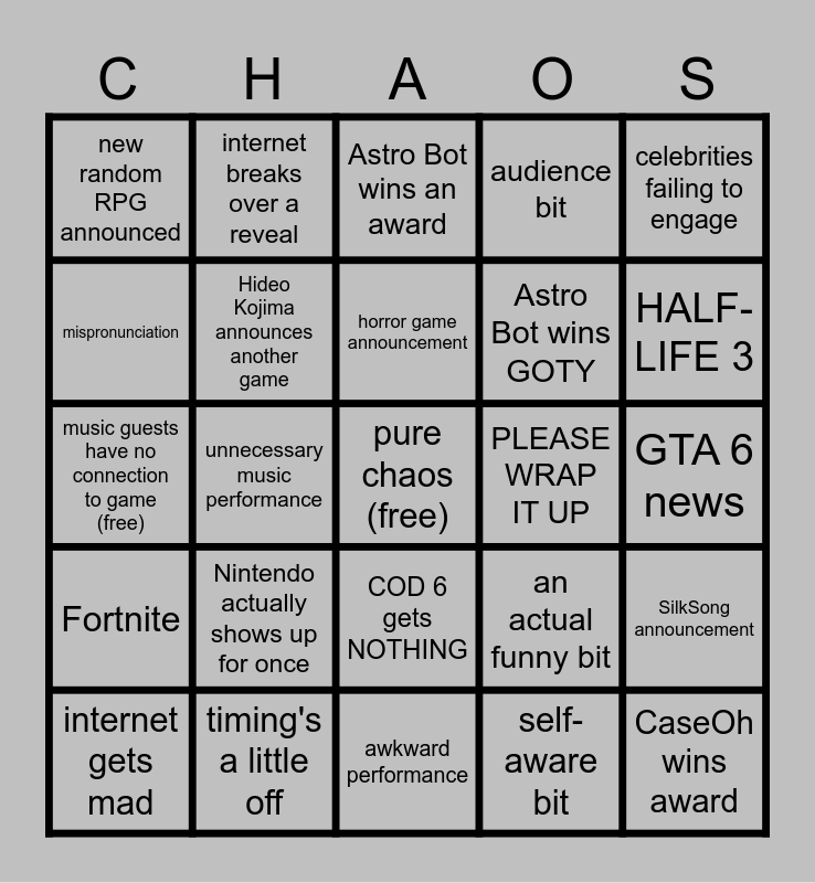 This bingo card has a free space and 31 words: awkward performance, bad joke (at least 4), unnecessary music performance, Balatro wins 2 awards, new random RPG announced, Astro Bot wins an award, Hideo Kojima announces another game, an actual funny bit, PLEASE WRAP IT UP, self-aware bit, GTA 6 news, CaseOh wins award, something goes wrong, Hideo Kojima pranks us all again, HALF-LIFE 3, Geoff stares at the camera, SilkSong announcement, Nintendo actually shows up for once, Fortnite, COD 6 gets NOTHING, celebrities failing to engage, a new iconic bit is made, internet gets mad, internet breaks over a reveal, Astro Bot wins GOTY, mispronunciation, audience bit, music guests have no connection to game (free), timing's a little off, horror game announcement and Sid the Science Kid.