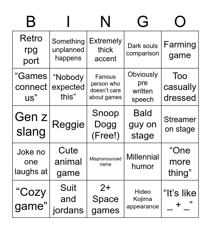 This bingo card has a free space and 24 words: Cute animal game, Suit and jordans, Famous person who doesn’t care about games, “Cozy game”, Farming game, Retro rpg port, “Games connect us”, Something unplanned happens, Bald guy on stage, Mispronounced name, Obviously pre written speech, Gen z slang, Millennial humor, “One more thing”, “Nobody expected this”, Hideo Kojima appearance, Streamer on stage, Extremely thick accent, Too casually dressed, Reggie, “It’s like _ + _”, Joke no one laughs at, Dark souls comparison and 2+ Space games.