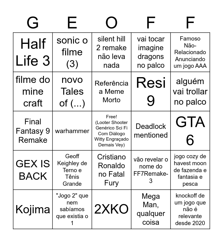 This bingo card has a free space and 24 words: Geoff Keighley de Terno e Tênis Grande, "Jogo 2" que nem sabíamos que existia o 1, Referência a Meme Morto, Kojima, Famoso Não-Relacionado Anunciando um jogo AAA, Half Life 3, filme do mine craft, sonic o filme (3), Deadlock mentioned, Cristiano Ronaldo no Fatal Fury, Resi 9, Final Fantasy 9 Remake, vão revelar o nome do FF7Remake-3, jogo cozy de havest moon de fazenda e fantasia e pesca, novo Tales of (...), Mega Man, qualquer coisa, GTA 6, silent hill 2 remake não leva nada, alguém vai trollar no palco, warhammer, knockoff de um jogo que não é relevante desde 2020, GEX IS BACK, vai tocar imagine dragons no palco and 2XKO.