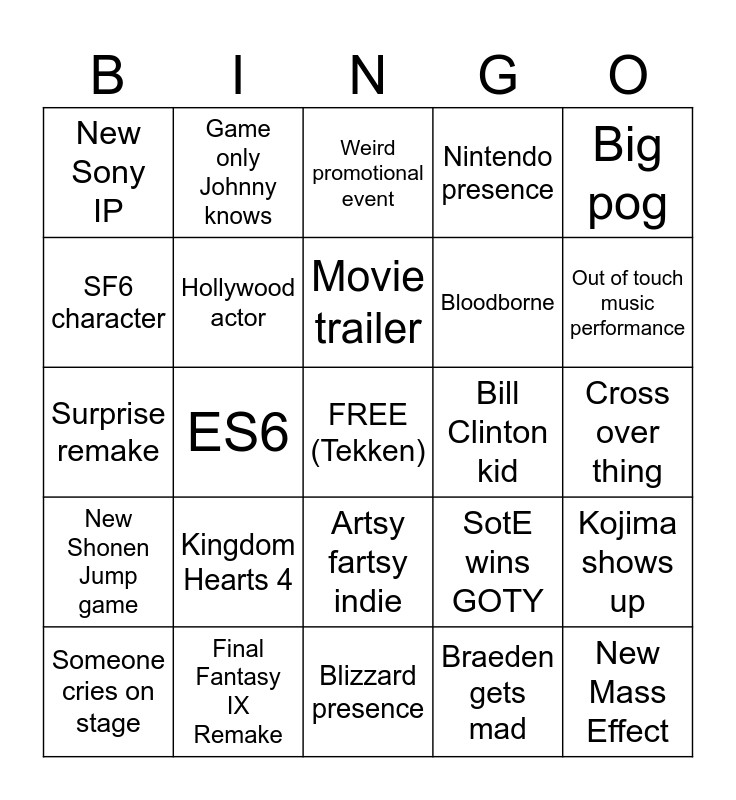 This bingo card has a free space and 24 words: Kingdom Hearts 4, Final Fantasy IX Remake, Movie trailer, Someone cries on stage, Big pog, New Sony IP, SF6 character, Game only Johnny knows, Bill Clinton kid, Artsy fartsy indie, Bloodborne, Surprise remake, SotE wins GOTY, Kojima shows up, Hollywood actor, Braeden gets mad, Cross over thing, Weird promotional event, Out of touch music performance, ES6, New Mass Effect, New Shonen Jump game, Nintendo presence and Blizzard presence.