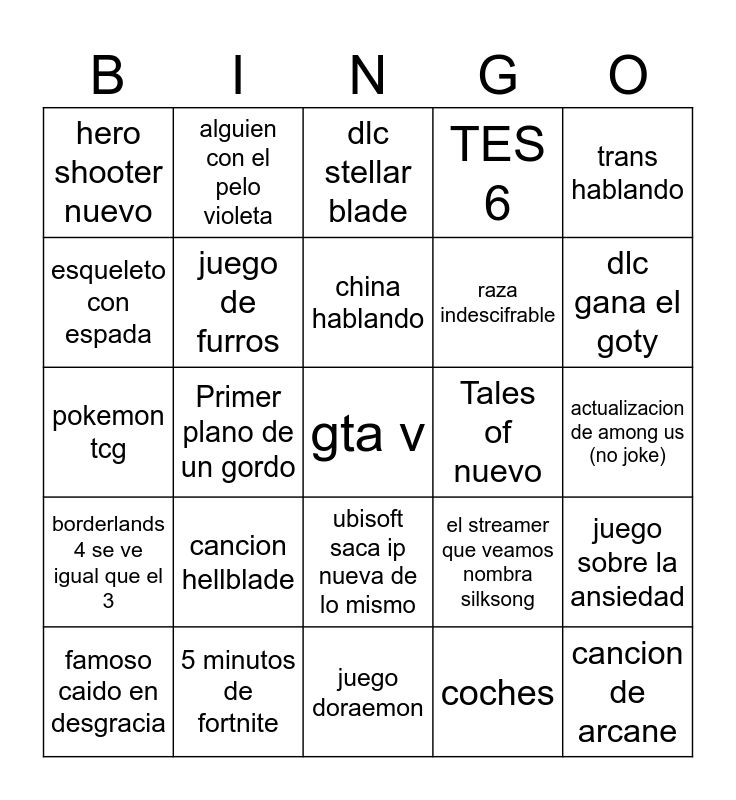 This bingo card has a free space and 24 words: cancion hellblade, 5 minutos de fortnite, china hablando, famoso caido en desgracia, trans hablando, hero shooter nuevo, esqueleto con espada, alguien con el pelo violeta, Tales of nuevo, ubisoft saca ip nueva de lo mismo, raza indescifrable, pokemon tcg, el streamer que veamos nombra silksong, juego sobre la ansiedad, juego de furros, coches, actualizacion de among us (no joke), dlc stellar blade, dlc gana el goty, Primer plano de un gordo, cancion de arcane, borderlands 4 se ve igual que el 3, TES 6 and juego doraemon.