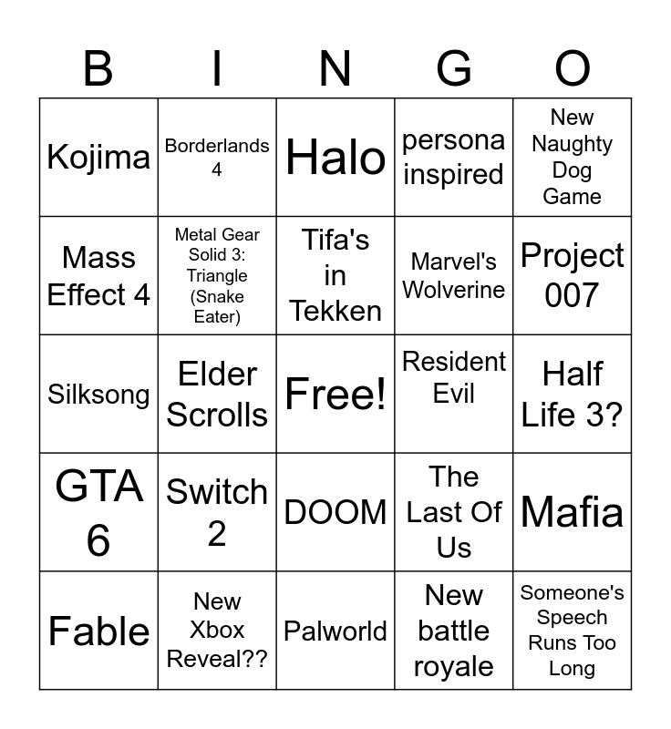 This bingo card has a free space and 25 words: Switch 2, Palworld, Tifa's in Tekken, Fable, New Naughty Dog Game, Kojima, Mass Effect 4, Borderlands 4, Resident Evil, DOOM, Marvel's Wolverine, Silksong, The Last Of Us, Mafia, Metal Gear Solid 3: Triangle (Snake Eater), GoW: E-Day, Half Life 3?, Halo, Project 007, Elder Scrolls, Someone's Speech Runs Too Long, New Xbox Reveal??, GTA 6, persona inspired and New battle royale.