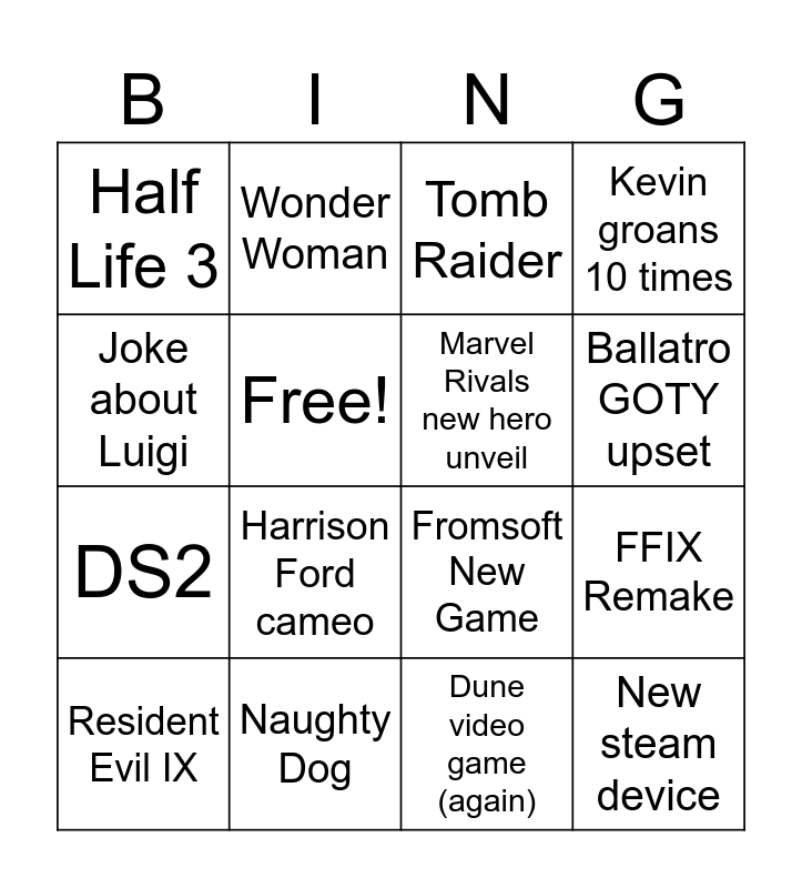 This bingo card has 16 words: Naughty Dog, FFIX Remake, Tomb Raider, Half Life 3, DS2, Wonder Woman, Fromsoft New Game, Dune video game (again), Joke about Luigi, Free!, Resident Evil IX, Kevin groans 10 times, Harrison Ford cameo, Ballatro GOTY upset, Marvel Rivals new hero unveil and New steam device.