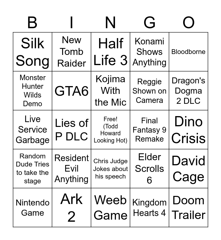 This bingo card has a free space and 24 words: Nintendo Game, Resident Evil Anything, Kojima With the Mic, Kingdom Hearts 4, Bloodborne, Silk Song, New Tomb Raider, Half Life 3, Final Fantasy 9 Remake, Dino Crisis, Live Service Garbage, GTA6, Elder Scrolls 6, David Cage, Monster Hunter Wilds Demo, Ark 2, Weeb Game, Konami Shows Anything, Dragon's Dogma 2 DLC, Random Dude Tries to take the stage, Lies of P DLC, Chris Judge Jokes about his speech, Reggie Shown on Camera and Doom Trailer.