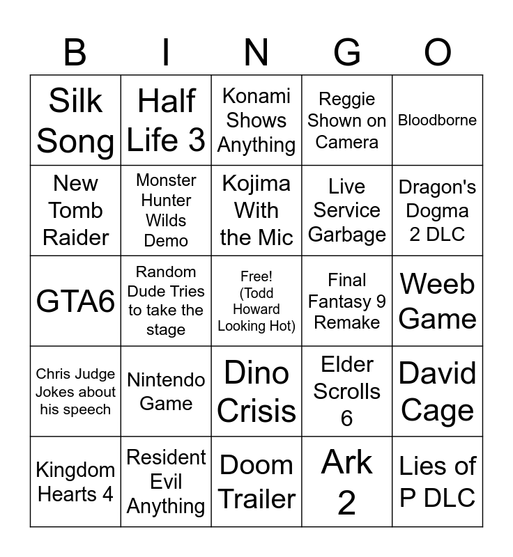This bingo card has a free space and 24 words: Nintendo Game, Resident Evil Anything, Kojima With the Mic, Kingdom Hearts 4, Bloodborne, Silk Song, New Tomb Raider, Half Life 3, Final Fantasy 9 Remake, Dino Crisis, Live Service Garbage, GTA6, Elder Scrolls 6, David Cage, Monster Hunter Wilds Demo, Ark 2, Weeb Game, Konami Shows Anything, Dragon's Dogma 2 DLC, Random Dude Tries to take the stage, Lies of P DLC, Chris Judge Jokes about his speech, Reggie Shown on Camera and Doom Trailer.