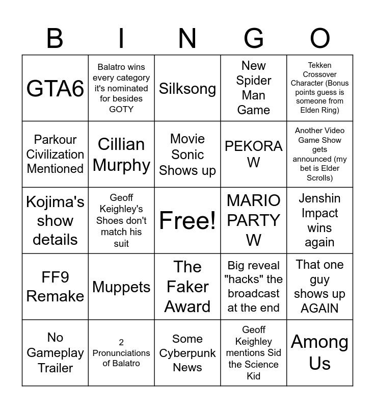 This bingo card has a free space and 24 words: Muppets, 2 Pronunciations of Balatro, Movie Sonic Shows up, No Gameplay Trailer, Tekken Crossover Character (Bonus points guess is someone from Elden Ring), GTA6, Parkour Civilization Mentioned, Balatro wins every category it's nominated for besides GOTY, MARIO PARTY W, The Faker Award, PEKORA W, Kojima's show details, Big reveal "hacks" the broadcast at the end, That one guy shows up AGAIN, Cillian Murphy, Geoff Keighley mentions Sid the Science Kid, Jenshin Impact wins again, Silksong, Another Video Game Show gets announced (my bet is Elder Scrolls), Geoff Keighley's Shoes don't match his suit, Among Us, FF9 Remake, New Spider Man Game and Some Cyberpunk News.
