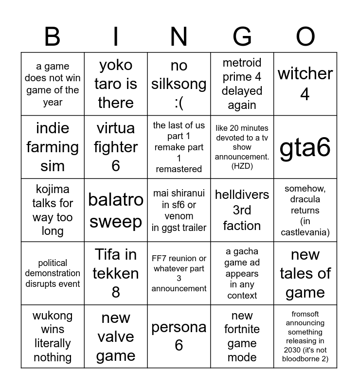 This bingo card has a free space and 24 words: Tifa in tekken 8, new valve game, the last of us part 1 remake part 1 remastered, wukong wins literally nothing, witcher 4, a game does not win game of the year, indie farming sim, yoko taro is there, helldivers 3rd faction, FF7 reunion or whatever part 3 announcement, like 20 minutes devoted to a tv show announcement. (HZD), kojima talks for way too long, a gacha game ad appears in any context, new tales of game, virtua fighter 6, new fortnite game mode, somehow, dracula returns (in castlevania), no silksong :(, gta6, balatro sweep, fromsoft announcing something releasing in 2030 (it's not bloodborne 2), political demonstration disrupts event, metroid prime 4 delayed again and persona 6.
