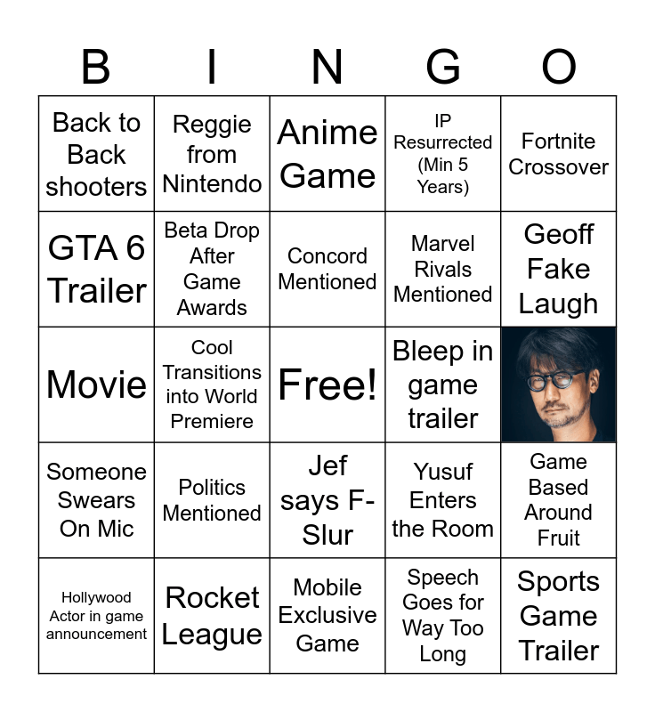 This bingo card has 1 images, a free space and 23 words: Politics Mentioned, Rocket League, Concord Mentioned, Hollywood Actor in game announcement, Fortnite Crossover, Back to Back shooters, GTA 6 Trailer, Reggie from Nintendo, Bleep in game trailer, Jef says F-Slur, Marvel Rivals Mentioned, Movie, Yusuf Enters the Room, Game Based Around Fruit, Beta Drop After Game Awards, Speech Goes for Way Too Long, Anime Game, Geoff Fake Laugh, Cool Transitions into World Premiere, Sports Game Trailer, Someone Swears On Mic, IP Resurrected (Min 5 Years) and Mobile Exclusive Game.