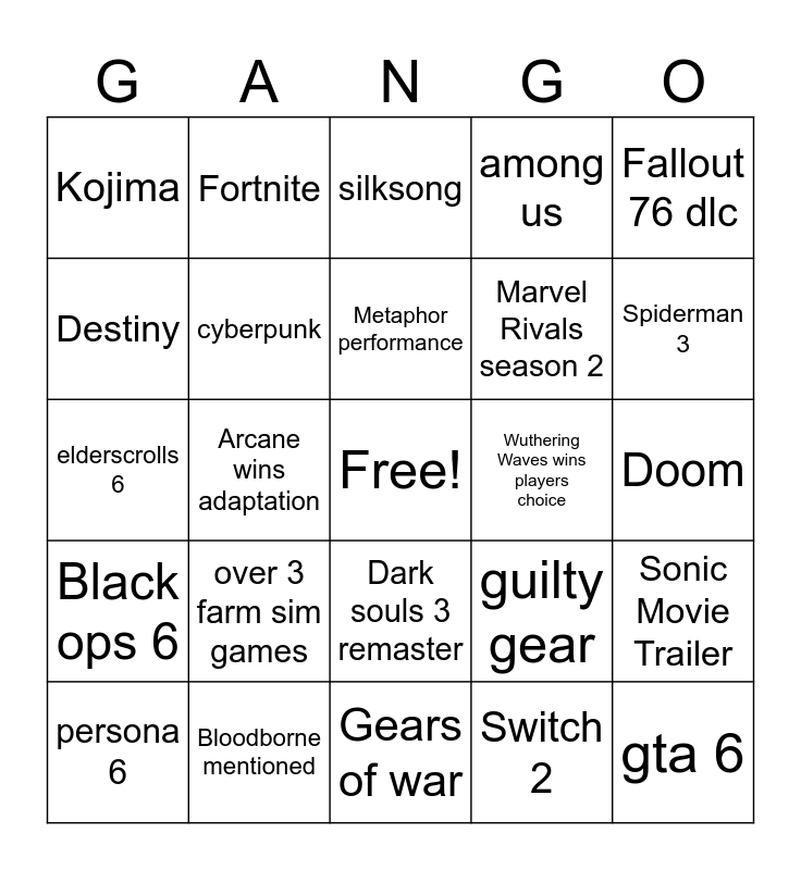 This bingo card has a free space and 24 words: persona 6, over 3 farm sim games, Metaphor performance, Switch 2, Fallout 76 dlc, Kojima, Fortnite, silksong, Wuthering Waves wins players choice, Doom, elderscrolls 6, cyberpunk, guilty gear, Sonic Movie Trailer, Destiny, Bloodborne mentioned, Gears of war, among us, Spiderman 3, Black ops 6, Arcane wins adaptation, Dark souls 3 remaster, Marvel Rivals season 2 and gta 6.