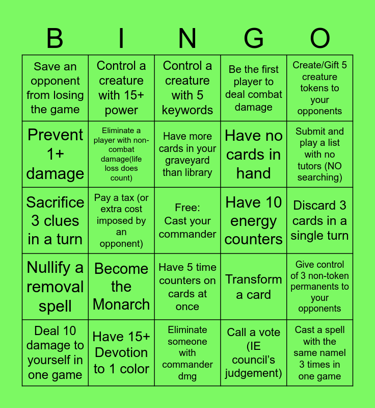 This bingo card has a free space and 24 words: Become the Monarch, Have 15+ Devotion to 1 color, Have more cards in your graveyard than library, Deal 10 damage to yourself in one game, Create/Gift 5 creature tokens to your opponents, Save an opponent from losing the game, Prevent 1+ damage, Control a creature with 15+ power, Have 10 energy counters, Have 5 time counters on cards at once, Have no cards in hand, Sacrifice 3 clues in a turn, Transform a card, Give control of 3 non-token permanents to your opponents, Eliminate a player with non-combat damage(life loss does count), Call a vote (IE council’s judgement), Discard 3 cards in a single turn, Control a creature with 5 keywords, Submit and play a list with no tutors (NO searching), Pay a tax (or extra cost imposed by an opponent), Cast a spell with the same namel 3 times in one game, Nullify a removal spell, Be the first player to deal combat damage and Eliminate someone with commander dmg.