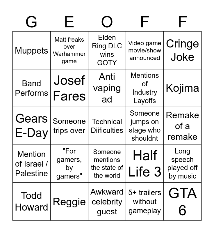 This bingo card has 25 words: "For gamers, by gamers", Awkward celebrity guest, Anti vaping ad, Todd Howard, Cringe Joke, Muppets, Band Performs, Matt freaks over Warhammer game, Someone jumps on stage who shouldnt, Someone mentions the state of the world, Mentions of Industry Layoffs, Gears E-Day, Half Life 3, Long speech played off by music, Josef Fares, GTA 6, Remake of a remake, Elden Ring DLC wins GOTY, Kojima, Someone trips over, Technical Diificulties, Reggie, Mention of Israel / Palestine, Video game movie/show announced and 5+ trailers without gameplay.