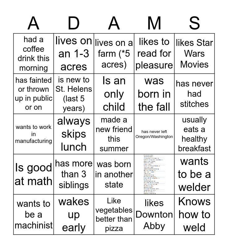 This bingo card has 1 images and 26 words: Knows how to weld, was born in the fall, Like vegetables better than pizza, has fainted or thrown up in public or on, lives on a farm (*5 acres), lives on an 1-3 acres, Is good at math, has never left Oregon/Washington, wants to be a welder, wants to work in manufacturing, likes to read for pleasure, wants to be a machinist, wakes up early, has never had stitches, lived in more than 4 cities, is new to St. Helens (last 5 years), Is an only child, has more than 3 siblings, had a coffee drink this morning, usually eats a healthy breakfast, likes Downton Abby, always skips lunch, made a new friend this summer, was born in another state, likes Star Wars Movies and likes Harry Potter Movies.
