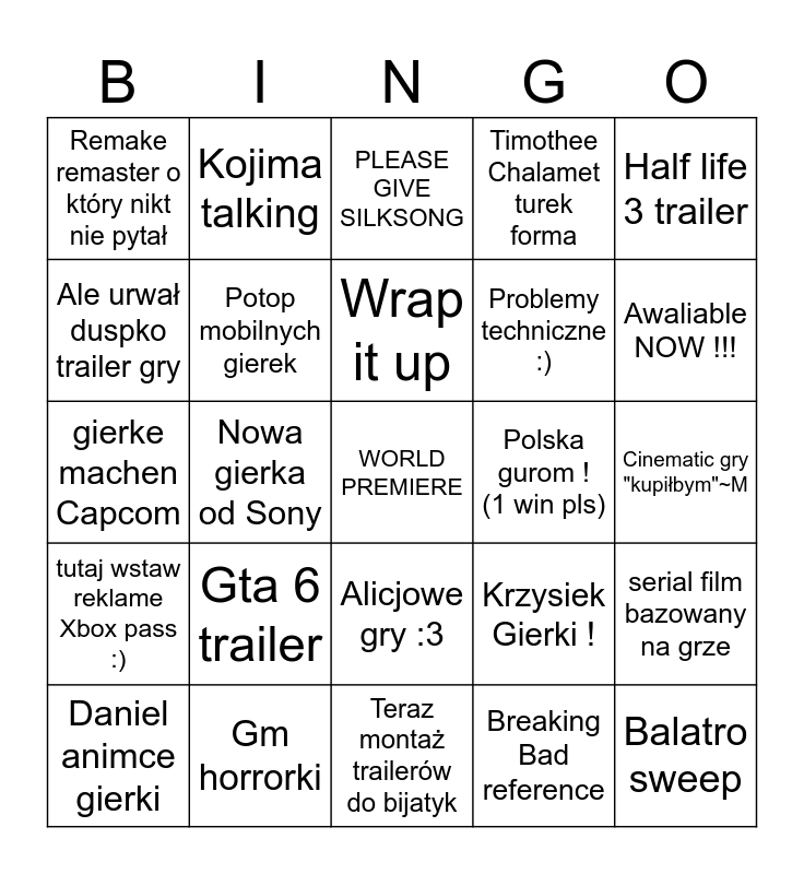 This bingo card has a free space and 24 words: Daniel animce gierki, Gta 6 trailer, Wrap it up, Breaking Bad reference, Half life 3 trailer, Remake remaster o który nikt nie pytał, Kojima talking, PLEASE GIVE SILKSONG, Polska gurom ! (1 win pls), Cinematic gry "kupiłbym"~M, gierke machen Capcom, Potop mobilnych gierek, Krzysiek Gierki !, serial film bazowany na grze, Ale urwał duspko trailer gry, Gm horrorki, Teraz montaż trailerów do bijatyk, Timothee Chalamet turek forma, Awaliable NOW !!!, tutaj wstaw reklame Xbox pass :), Nowa gierka od Sony, Alicjowe gry :3, Problemy techniczne :) and Balatro sweep.