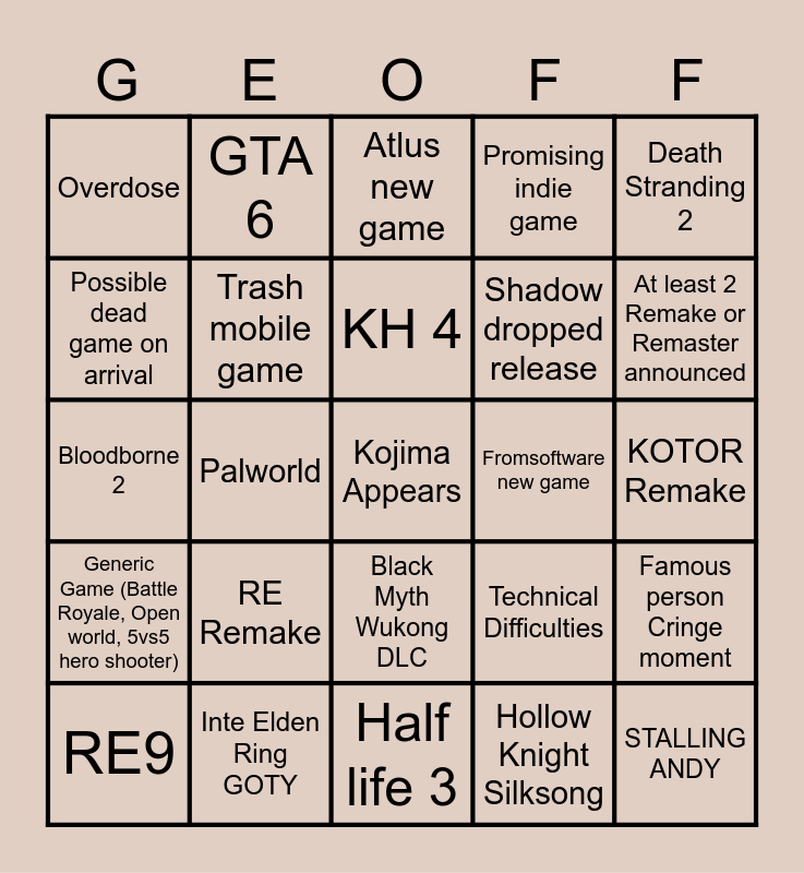 This bingo card has a free space and 24 words: RE9, RE Remake, KH 4, Hollow Knight Silksong, Death Stranding 2, Overdose, GTA 6, Atlus new game, Fromsoftware new game, KOTOR Remake, Bloodborne 2, Trash mobile game, Technical Difficulties, Famous person Cringe moment, Possible dead game on arrival, Inte Elden Ring GOTY, Half life 3, Promising indie game, At least 2 Remake or Remaster announced, Generic Game (Battle Royale, Open world, 5vs5 hero shooter), Palworld, Black Myth Wukong DLC, Shadow dropped release and STALLING ANDY.