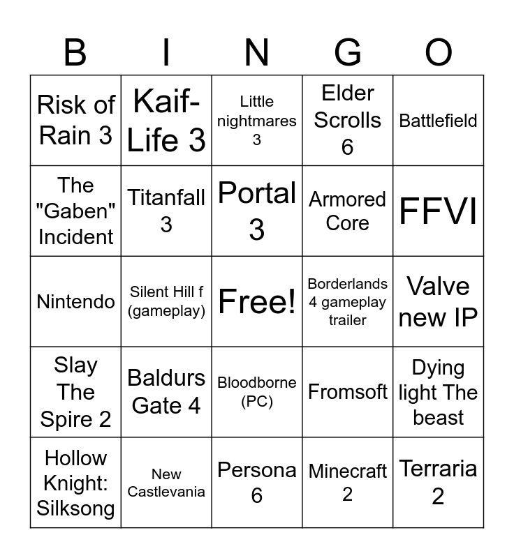 This bingo card has a free space and 24 words: Baldurs Gate 4, New Castlevania, Portal 3, Hollow Knight: Silksong, Battlefield, Risk of Rain 3, The "Gaben" Incident, Kaif-Life 3, Borderlands 4 gameplay trailer, Bloodborne (PC), Armored Core, Nintendo, Fromsoft, Dying light The beast, Titanfall 3, Minecraft 2, Valve new IP, Little nightmares 3, FFVI, Silent Hill f (gameplay), Terraria 2, Slay The Spire 2, Elder Scrolls 6 and Persona 6.