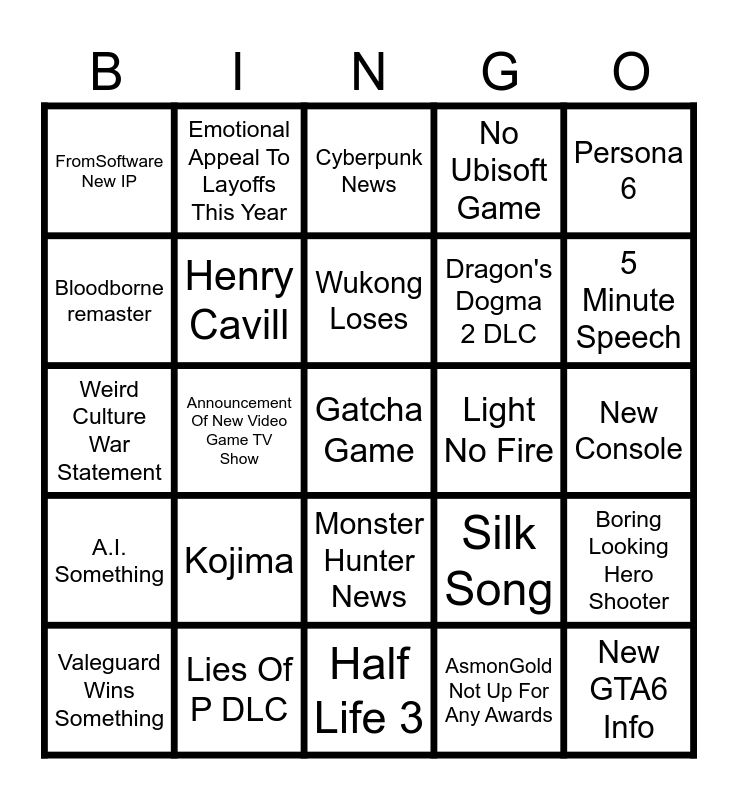 This bingo card has 25 words: Kojima, Half Life 3, Wukong Loses, Valeguard Wins Something, Persona 6, FromSoftware New IP, Bloodborne remaster, Emotional Appeal To Layoffs This Year, Light No Fire, Monster Hunter News, Dragon's Dogma 2 DLC, Weird Culture War Statement, Silk Song, Boring Looking Hero Shooter, Henry Cavill, New GTA6 Info, New Console, Cyberpunk News, 5 Minute Speech, Announcement Of New Video Game TV Show, Gatcha Game, Lies Of P DLC, A.I. Something, No Ubisoft Game and AsmonGold Not Up For Any Awards.