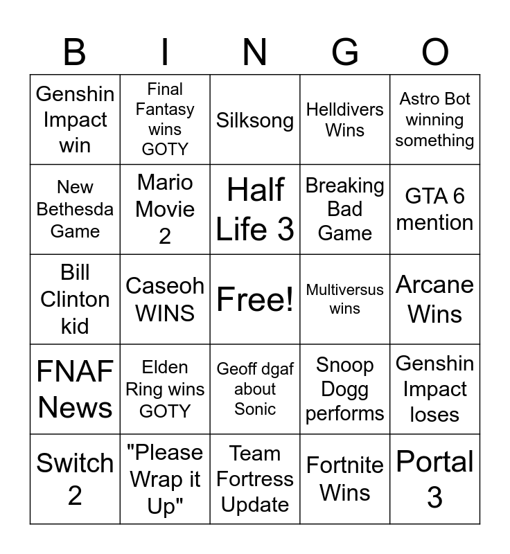 This bingo card has a free space and 24 words: Elden Ring wins GOTY, "Please Wrap it Up", Half Life 3, Switch 2, Astro Bot winning something, Genshin Impact win, New Bethesda Game, Final Fantasy wins GOTY, Multiversus wins, Geoff dgaf about Sonic, Breaking Bad Game, Bill Clinton kid, Snoop Dogg performs, Genshin Impact loses, Mario Movie 2, Fortnite Wins, Arcane Wins, Silksong, GTA 6 mention, Caseoh WINS, Portal 3, FNAF News, Helldivers Wins and Team Fortress Update.