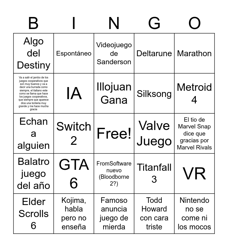 This bingo card has a free space and 24 words: GTA 6, Kojima, habla pero no enseña, Illojuan Gana, Elder Scrolls 6, Marathon, Algo del Destiny, Va a salir el jambo de los juegos cooperativos que son muy buenos y va a decir una burrada como siempre, el italiano este como se llama que hace los juegos cooperativos, que siempre que aparece dice una tonteria muy grande y me hace mucha gracia, Espontáneo, Valve Juego, FromSoftware nuevo (Bloodborne 2?), Silksong, Echan a alguien, Titanfall 3, VR, IA, Todd Howard con cara triste, El tio de Marvel Snap dice que gracias por Marvel Rivals, Videojuego de Sanderson, Metroid 4, Switch 2, Nintendo no se come ni los mocos, Balatro juego del año, Deltarune and Famoso anuncia juego de mierda.