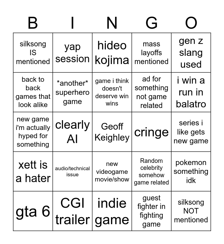 This bingo card has a free space and 24 words: audio/technical issue, CGI trailer, game i think doesn't deserve win wins, gta 6, gen z slang used, silksong IS mentioned, back to back games that look alike, yap session, cringe, new videogame movie/show, ad for something not game related, new game i'm actually hyped for something, Random celebrity somehow game related, pokemon something idk, *another* superhero game, guest fighter in fighting game, series i like gets new game, hideo kojima, i win a run in balatro, clearly AI, silksong NOT mentioned, xett is a hater, mass layoffs mentioned and indie game.