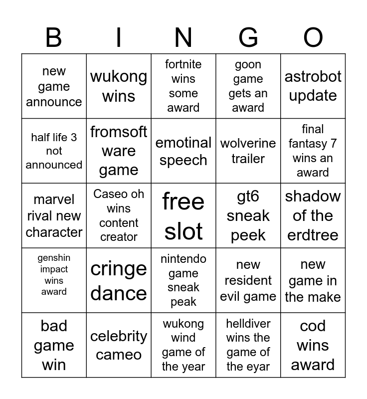 This bingo card has a free space and 24 words: cringe dance, celebrity cameo, emotinal speech, bad game win, astrobot update, new game announce, half life 3 not announced, wukong wins, gt6 sneak peek, nintendo game sneak peak, wolverine trailer, marvel rival new character, new resident evil game, new game in the make, fromsoft ware game, helldiver wins the game of the eyar, shadow of the erdtree, fortnite wins some award, final fantasy 7 wins an award, Caseo oh wins content creator, cod wins award, genshin impact wins award, goon game gets an award and wukong wind game of the year.