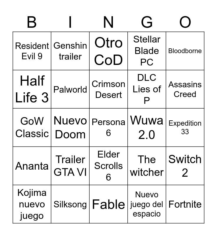This bingo card has a free space and 24 words: Trailer GTA VI, Silksong, Crimson Desert, Kojima nuevo juego, Bloodborne, Resident Evil 9, Half Life 3, Genshin trailer, Wuwa 2.0, Elder Scrolls 6, DLC Lies of P, GoW Classic, The witcher, Switch 2, Palworld, Nuevo juego del espacio, Expedition 33, Otro CoD, Assasins Creed, Nuevo Doom, Fortnite, Ananta, Stellar Blade PC and Fable.
