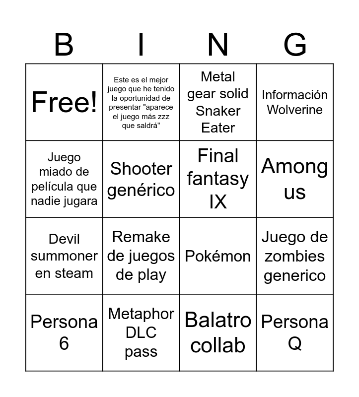 This bingo card has 16 words: Persona 6, Metaphor DLC pass, Metal gear solid Snaker Eater, Información Wolverine, Juego miado de película que nadie jugara, Este es el mejor juego que he tenido la oportunidad de presentar "aparece el juego más zzz que saldrá", Pokémon, Juego de zombies generico, Free!, Shooter genérico, Balatro collab, Among us, Devil summoner en steam, Remake de juegos de play, Final fantasy IX and Persona Q.