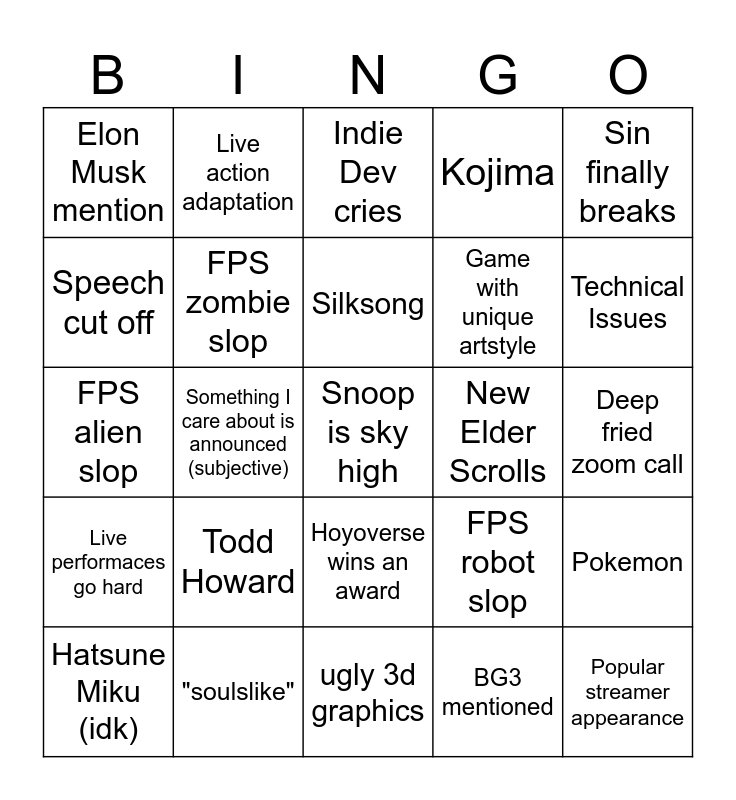 This bingo card has a free space and 24 words: Hatsune Miku (idk), Todd Howard, Silksong, BG3 mentioned, Sin finally breaks, Elon Musk mention, Live action adaptation, Indie Dev cries, New Elder Scrolls, Deep fried zoom call, FPS alien slop, FPS zombie slop, FPS robot slop, Pokemon, Speech cut off, "soulslike", ugly 3d graphics, Kojima, Technical Issues, Live performaces go hard, Something I care about is announced (subjective), Hoyoverse wins an award, Game with unique artstyle and Popular streamer appearance.