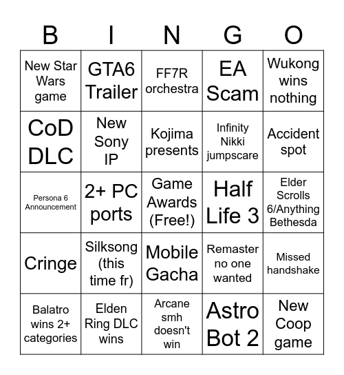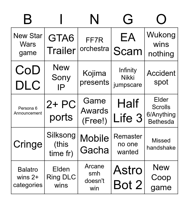 This bingo card has a free space and 24 words: Silksong (this time fr), Elden Ring DLC wins, Kojima presents, Balatro wins 2+ categories, Wukong wins nothing, New Star Wars game, CoD DLC, GTA6 Trailer, Half Life 3, Mobile Gacha, Infinity Nikki jumpscare, Persona 6 Announcement, Remaster no one wanted, Missed handshake, New Sony IP, Astro Bot 2, Elder Scrolls 6/Anything Bethesda, FF7R orchestra, Accident spot, 2+ PC ports, New Coop game, Cringe, EA Scam and Arcane smh doesn't win.