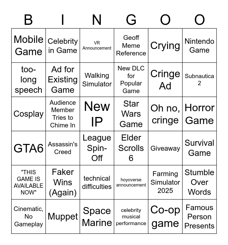 This bingo card has 36 words: hoyoverse announcement, technical difficulties, celebrity musical performance, too-long speech, GTA6, Star Wars Game, Ad for Existing Game, Space Marine, Crying, Farming Simulator 2025, Subnautica 2, Geoff Meme Reference, Stumble Over Words, Audience Member Tries to Chime In, New DLC for Popular Game, Mobile Game, "THIS GAME IS AVAILABLE NOW", Oh no, cringe, Cosplay, VR Announcement, New IP, Assassin's Creed, Elder Scrolls 6, League Spin-Off, Giveaway, Celebrity in Game, Cringe Ad, Muppet, Walking Simulator, Nintendo Game, Famous Person Presents, Cinematic, No Gameplay, Survival Game, Horror Game, Faker Wins (Again) and Co-op game.