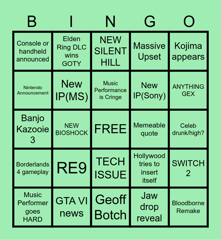 This bingo card has a free space and 24 words: RE9, GTA VI news, Music Performance is Cringe, Music Performer goes HARD, Kojima appears, Console or handheld announced, Nintendo Announcement, Elden Ring DLC wins GOTY, Memeable quote, TECH ISSUE, New IP(Sony), Banjo Kazooie 3, Hollywood tries to insert itself, SWITCH 2, New IP(MS), Jaw drop reveal, Celeb drunk/high?, NEW SILENT HILL, ANYTHING GEX, NEW BIOSHOCK, Bloodborne Remake, Borderlands 4 gameplay, Massive Upset and Geoff Botch.