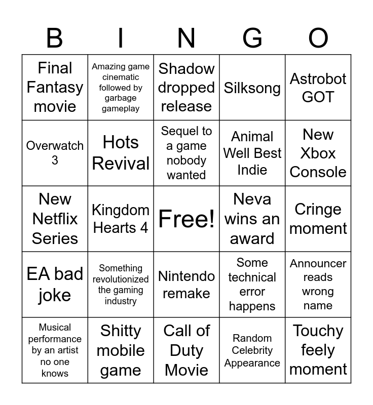 This bingo card has a free space and 24 words: Something revolutionized the gaming industry, Shitty mobile game, Sequel to a game nobody wanted, Musical performance by an artist no one knows, Astrobot GOT, Final Fantasy movie, Overwatch 3, Amazing game cinematic followed by garbage gameplay, Neva wins an award, Nintendo remake, Animal Well Best Indie, New Netflix Series, Some technical error happens, Announcer reads wrong name, Hots Revival, Random Celebrity Appearance, Cringe moment, Shadow dropped release, New Xbox Console, Kingdom Hearts 4, Touchy feely moment, EA bad joke, Silksong and Call of Duty Movie.