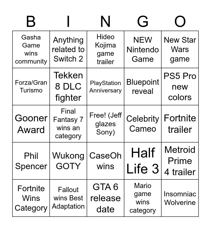 This bingo card has a free space and 24 words: Wukong GOTY, Fallout wins Best Adaptation, PlayStation Anniversary, Fortnite Wins Category, New Star Wars game, Gasha Game wins community, Forza/Gran Turismo, Anything related to Switch 2, Celebrity Cameo, CaseOh wins, Bluepoint reveal, Gooner Award, Half Life 3, Metroid Prime 4 trailer, Tekken 8 DLC fighter, Mario game wins category, Fortnite trailer, Hideo Kojima game trailer, PS5 Pro new colors, Final Fantasy 7 wins an category, Insomniac Wolverine, Phil Spencer, NEW Nintendo Game and GTA 6 release date.
