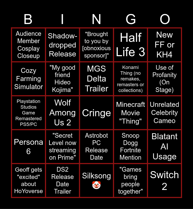 This bingo card has a free space and 24 words: "Secret Level now streaming on Prime", DS2 Release Date Trailer, MGS Delta Trailer, Geoff gets "excited" about HoYoverse, New FF or KH4, Audience Member Cosplay Closeup, Cozy Farming Simulator, Shadow-dropped Release, Minecraft Movie "Thing", Astrobot PC Release Date, Konami Thing (no remakes, remasters or collections), Playstation Studios Game Remastered PS5/PC, Snoop Dogg Fortnite Mention, Blatant AI Usage, "My good friend Hideo Kojima", "Games bring people together", Unrelated Celebrity Cameo, "Brought to you by [obnoxious sponsor]", Use of Profanity (On Stage), Wolf Among Us 2, Switch 2, Persona 6, Half Life 3 and Silksong 🤡.