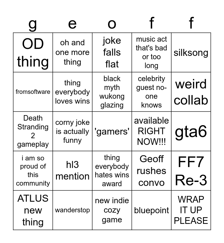 This bingo card has a free space and 24 words: hl3 mention, wanderstop, black myth wukong glazing, ATLUS new thing, silksong, OD thing, fromsoftware, oh and one more thing, available RIGHT NOW!!!, thing everybody hates wins award, celebrity guest no-one knows, Death Stranding 2 gameplay, Geoff rushes convo, FF7 Re-3, thing everybody loves wins, bluepoint, gta6, joke falls flat, weird collab, corny joke is actually funny, WRAP IT UP PLEASE, i am so proud of this community, music act that's bad or too long and new indie cozy game.