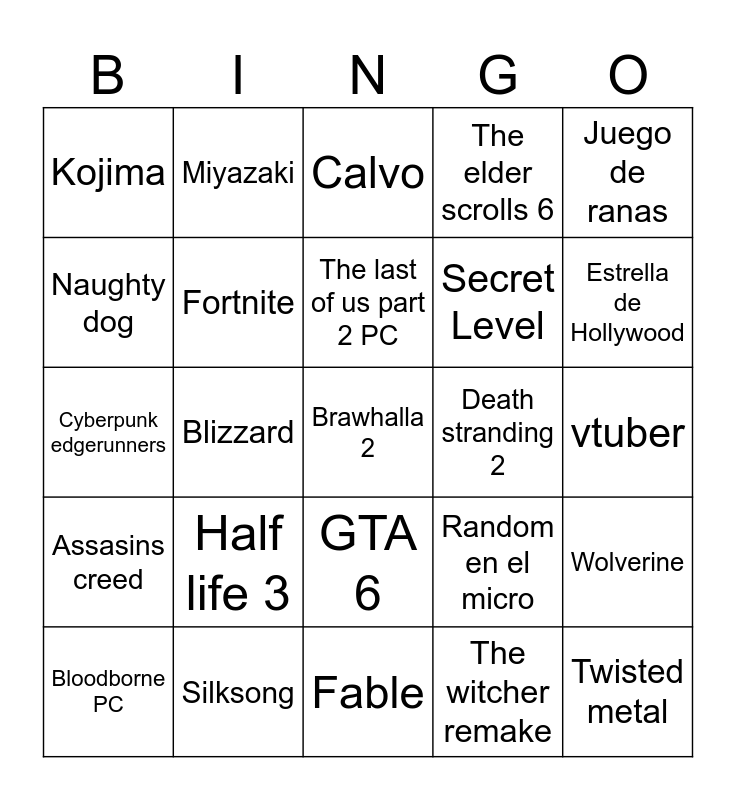 This bingo card has a free space and 24 words: Half life 3, Silksong, The last of us part 2 PC, Bloodborne PC, Juego de ranas, Kojima, Naughty dog, Miyazaki, Death stranding 2, GTA 6, Secret Level, Cyberpunk edgerunners, Random en el micro, Wolverine, Fortnite, The witcher remake, vtuber, Calvo, Estrella de Hollywood, Blizzard, Twisted metal, Assasins creed, The elder scrolls 6 and Fable.