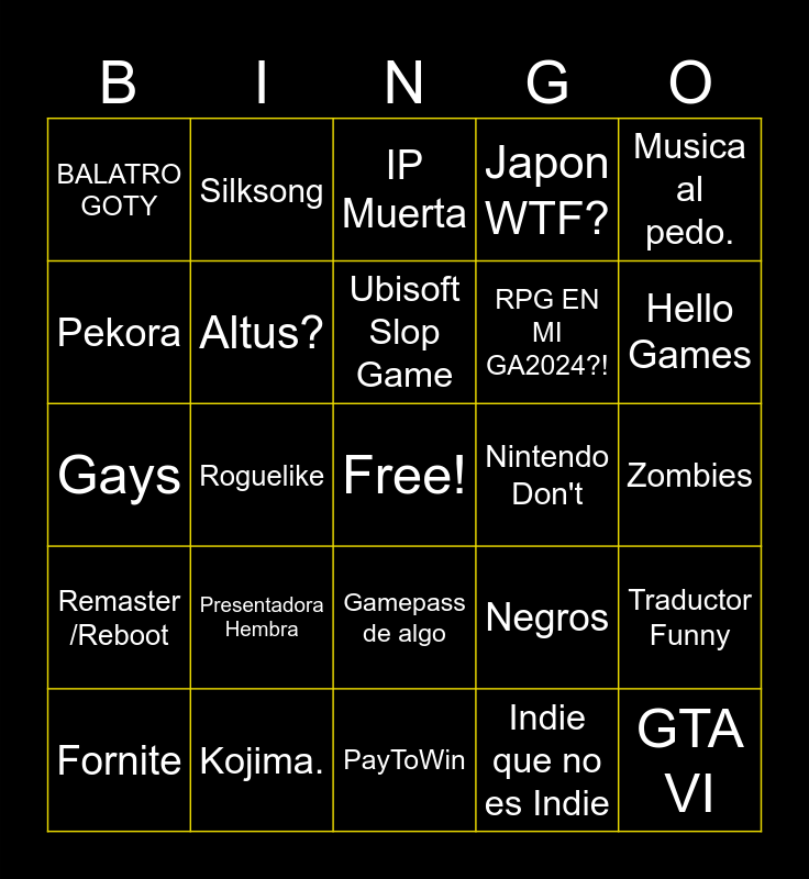 This bingo card has a free space and 24 words: Presentadora Hembra, Kojima., Ubisoft Slop Game, Fornite, Musica al pedo., BALATRO GOTY, Pekora, Silksong, Nintendo Don't, Gamepass de algo, RPG EN MI GA2024?!, Gays, Negros, Traductor Funny, Altus?, Indie que no es Indie, Zombies, IP Muerta, Hello Games, Roguelike, GTA VI, Remaster /Reboot, Japon WTF? and PayToWin.