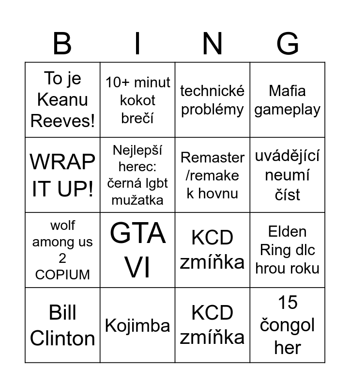 This bingo card has 20 words: Elden Ring dlc hrou roku, Uvádějící neumí číst, technické problémy, Špatnej mafia gameplay, Bill Clinton, WRAP IT UP!, Kojimba, To je Keanu Reeves!, wolf among us 2 COPIUM, 10+ minut kokot brečí, GTA VI, KCD zmíňka, Nejlepší herec: černá lgbt mužatka, 15 čongol her, Remaster /remake k hovnu, HAHA vtípek, uvádějící neumí číst, Mafia gameplay, KCD zmíňka and Kojimba.