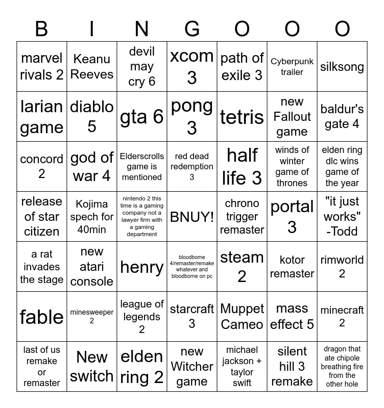 This bingo card has a free space and 48 words: Muppet Cameo, new Fallout game, new Witcher game, Kojima spech for 40min, Elderscrolls game is mentioned, "it just works" -Todd, Keanu Reeves, New switch, Cyberpunk trailer, bloodborne 4/remaster/remake whatever and bloodborne on pc, silksong, xcom 3, winds of winter game of thrones, half life 3, fable, portal 3, larian game, baldur's gate 4, mass effect 5, path of exile 3, tetris, nintendo 2 this time is a gaming company not a lawyer firm with a gaming department, marvel rivals 2, diablo 5, minecraft 2, gta 6, elden ring dlc wins game of the year, last of us remake or remaster, red dead redemption 3, god of war 4, silent hill 3 remake, chrono trigger remaster, rimworld 2, minesweeper 2, release of star citizen, steam 2, kotor remaster, concord 2, henry, league of legends 2, a rat invades the stage, dragon that ate chipole breathing fire from the other hole, devil may cry 6, elden ring 2, pong 3, starcraft 3, new atari console and michael jackson + taylor swift.