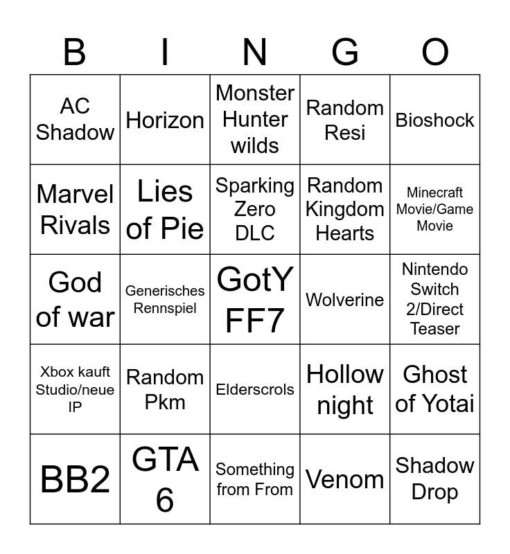 This bingo card has a free space and 24 words: BB2, Random Pkm, Sparking Zero DLC, Venom, Bioshock, AC Shadow, Horizon, Monster Hunter wilds, Wolverine, Nintendo Switch 2/Direct Teaser, God of war, Lies of Pie, Hollow night, Ghost of Yotai, Marvel Rivals, GTA 6, Something from From, Random Resi, Minecraft Movie/Game Movie, Xbox kauft Studio/neue IP, Generisches Rennspiel, Elderscrols, Random Kingdom Hearts and Shadow Drop.