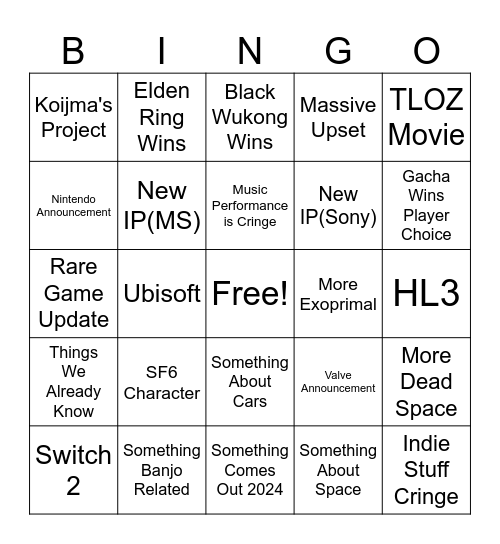 This bingo card has a free space and 24 words: SF6 Character, Something Banjo Related, Music Performance is Cringe, Switch 2, TLOZ Movie, Koijma's Project, Nintendo Announcement, Elden Ring Wins, More Exoprimal, Something About Cars, New IP(Sony), Rare Game Update, Valve Announcement, More Dead Space, New IP(MS), Something About Space, HL3, Black Wukong Wins, Gacha Wins Player Choice, Ubisoft, Indie Stuff Cringe, Things We Already Know, Massive Upset and Something Comes Out 2024.