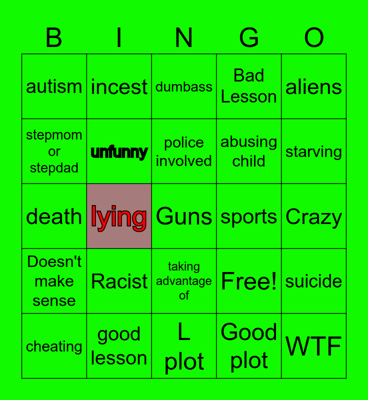 This bingo card has 25 words: Racist, L plot, police involved, cheating, aliens, autism, stepmom or stepdad, incest, sports, taking advantage of, abusing child, death, Free!, suicide, unfunny, WTF, Crazy, dumbass, starving, lying, Guns, good lesson, Doesn't make sense, Bad Lesson and Good plot.