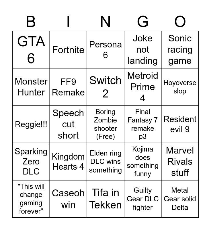 This bingo card has a free space and 24 words: Kingdom Hearts 4, Caseoh win, Switch 2, "This will change gaming forever", Sonic racing game, GTA 6, Monster Hunter, Fortnite, Final Fantasy 7 remake p3, Elden ring DLC wins something, Metroid Prime 4, Reggie!!!, Kojima does something funny, Marvel Rivals stuff, FF9 Remake, Guilty Gear DLC fighter, Resident evil 9, Persona 6, Hoyoverse slop, Speech cut short, Metal Gear solid Delta, Sparking Zero DLC, Joke not landing and Tifa in Tekken.