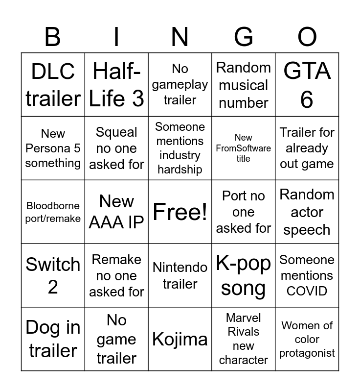 This bingo card has a free space and 29 words: Dog in trailer, False World Premiere, New AAA IP, Played off stage, DLC trailer, No gameplay trailer, Squeal no one asked for, Remake no one asked for, Port no one asked for, No game trailer, Random actor speech, Women of color protagonist, Kojima, Marvel Rivals new character, Trailer for already out game, “Available now”, Nintendo trailer, Switch 2, GTA 6, Bloodborne port/remake, K-pop song, New Silent Hill, New FromSoftware title, New Persona 5 something, Random musical number, Half-Life 3, Someone mentions COVID, Someone mentions industry hardship and “Realistic SIMS” trailer.