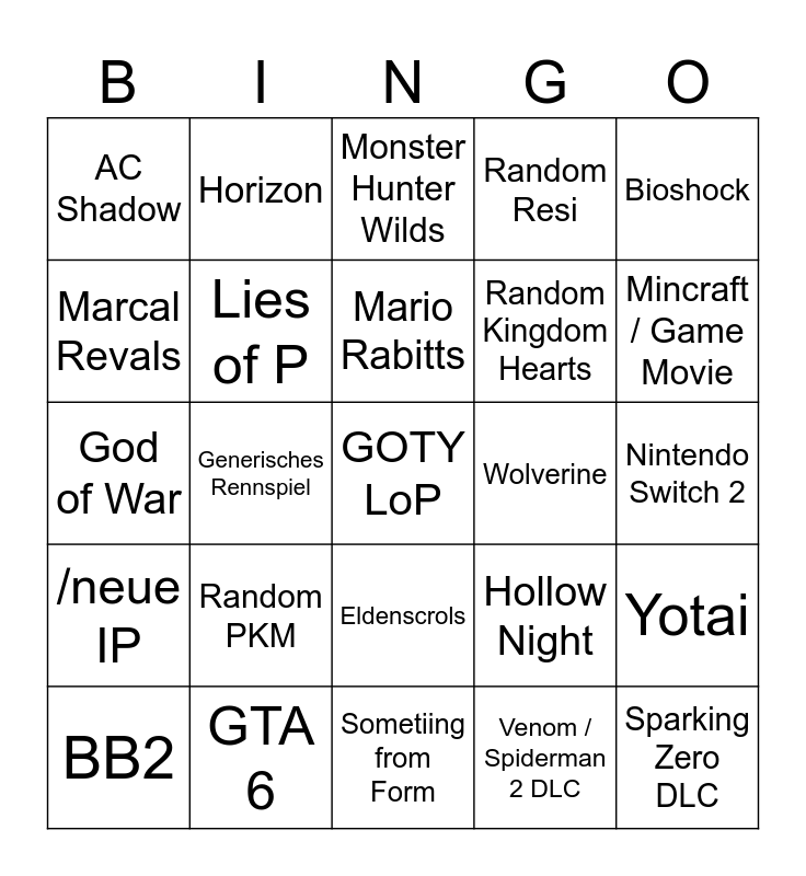 This bingo card has a free space and 24 words: BB2, Random PKM, Mario Rabitts, Venom / Spiderman 2 DLC, Bioshock, AC Shadow, Horizon, Monster Hunter Wilds, Wolverine, Nintendo Switch 2, God of War, Lies of P, Hollow Night, Yotai, Marcal Revals, GTA 6, Sometiing from Form, Random Resi, Mincraft / Game Movie, /neue IP, Generisches Rennspiel, Eldenscrols, Random Kingdom Hearts and Sparking Zero DLC.